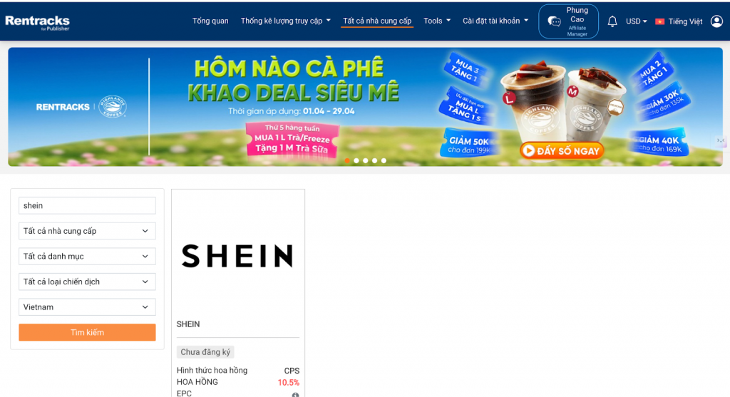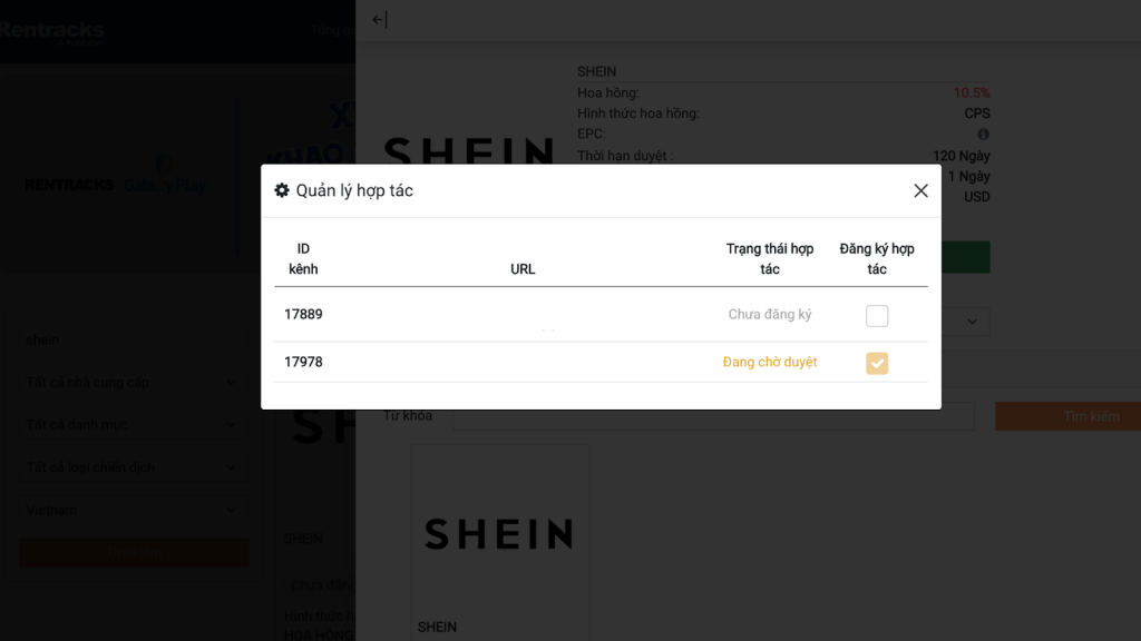 Sau khi tài khoản được tạo thành công, bạn có thể truy cập vào danh sách chiến dịch trong dashboard của network và tìm chương trình affiliate của Shein. Khi tìm thấy chiến dịch, publisher chỉ cần gửi yêu cầu tham gia để bắt đầu làm tiếp thị liên kết Shein.