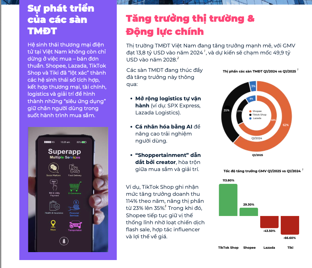 Về thị phần, TikTok Shop ghi nhận mức tăng trưởng vượt trội, phản ánh hiệu quả của xu hướng shoppertainment và vai trò ngày càng lớn của creator. Shopee tiếp tục giữ vị thế dẫn đầu nhờ quy mô và chiến lược giá, trong khi Lazada và Tiki đối mặt với áp lực thích nghi khi hành vi người tiêu dùng thay đổi nhanh.
