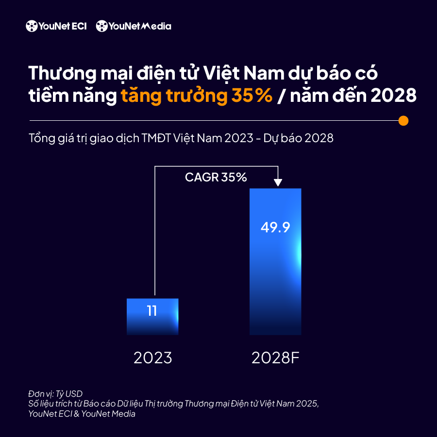 Theo báo cáo thương mại điện tử của YouNet ECI và YouNet Media, thị trường TMĐT Việt Nam được dự báo đạt mức tăng trưởng tích cực nhất từ 2019 đến nay, với CAGR lên tới 35% giai đoạn 2024–2028. Nếu tận dụng tốt các cơ hội tăng trưởng, tổng giá trị giao dịch TMĐT có thể chạm mốc 49,9 tỷ USD/năm vào 2028.