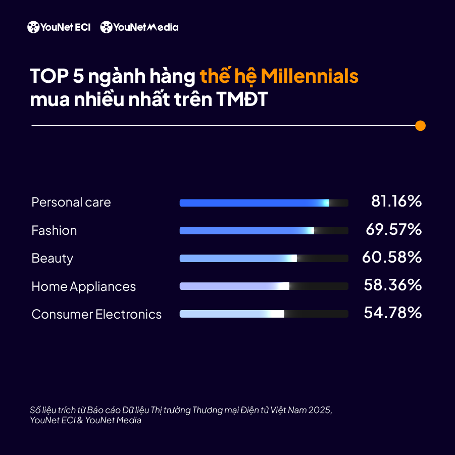 So với Gen Z, Millennials thể hiện hành vi mua sắm có kế hoạch và ổn định hơn. Nhóm này mua sắm trực tuyến thường xuyên, với mức chi tiêu trung bình mỗi đơn cao, đặc biệt ở các ngành hàng như điện gia dụng và điện tử tiêu dùng.