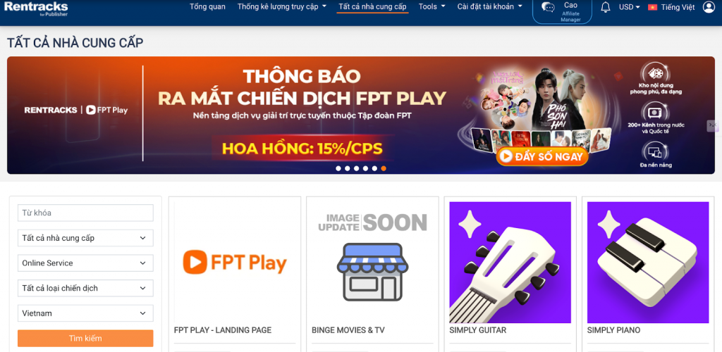 Rentracks cung cấp nhiều chiến dịch thuộc các lĩnh vực có nhu cầu cao như tài chính, thương mại điện tử, ứng dụng di động, giáo dục và dịch vụ số. Đây là những ngành có tệp người dùng rộng và hành vi chuyển đổi rõ ràng, giúp affiliate dễ dàng áp dụng đúng cách chọn chiến dịch affiliate phù hợp với nội dung và tệp khán giả của mình. Việc tiếp cận nhiều chiến dịch trên cùng một nền tảng cũng tạo điều kiện để bạn so sánh hiệu suất, tối ưu lựa chọn và xác định sản phẩm chuyển đổi cao dựa trên dữ liệu thực tế.