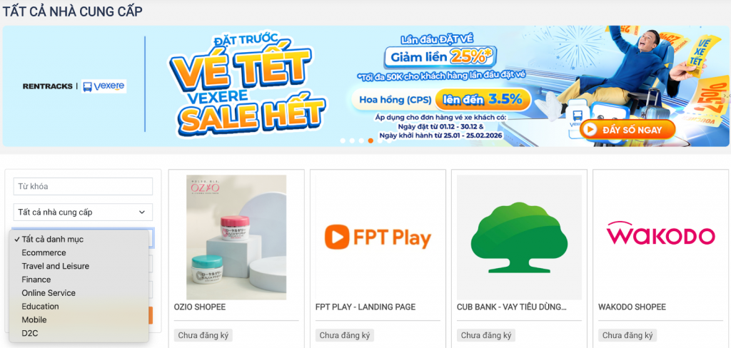 Sau khi đăng nhập, bạn có thể tìm kiếm và lựa chọn chiến dịch dựa trên lĩnh vực, mức hoa hồng và loại hành động chuyển đổi. Đây là bước quan trọng trong cách chọn chiến dịch affiliate, vì chiến dịch phù hợp sẽ giúp bạn tối ưu tỷ lệ chuyển đổi và tăng khả năng ra đơn.