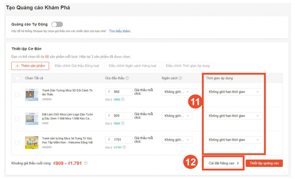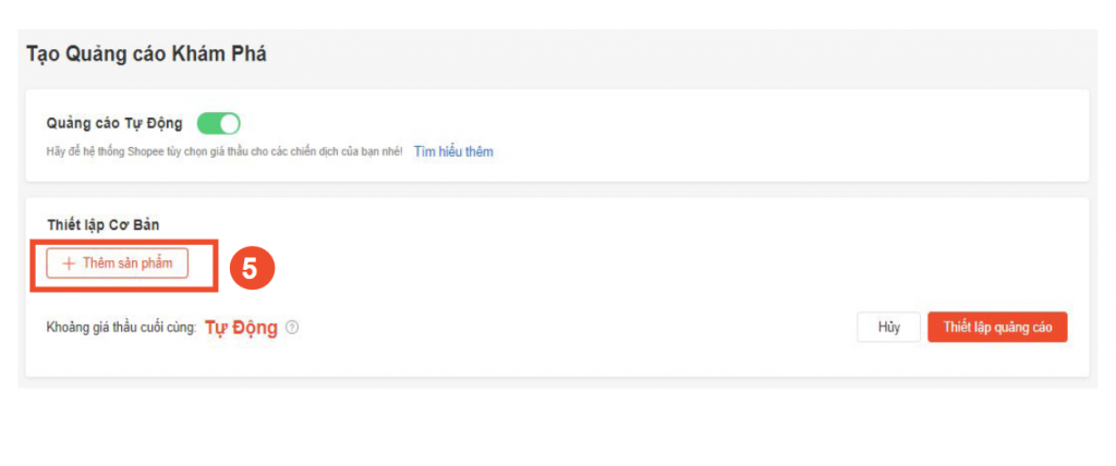 Sau khi mọi thiết lập đã hoàn chỉnh, nhấn “Thiết lập quảng cáo” để lưu và kích hoạt chiến dịch. Từ thời điểm đó, sản phẩm sẽ bắt đầu hiển thị trong kết quả tìm kiếm của Shopee khi người dùng nhập các từ khóa liên quan.