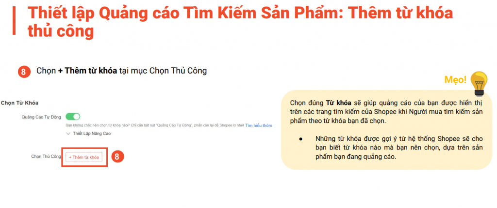 – Đối với quảng cáo tự động: Bạn có thể bật chế độ quảng cáo tự động, khi đó hệ thống Shopee sẽ tự động phân tích nội dung sản phẩm và chọn các từ khóa phù hợp. Phương thức này thường phù hợp với người mới bắt đầu vì giúp tiết kiệm thời gian nghiên cứu từ khóa.