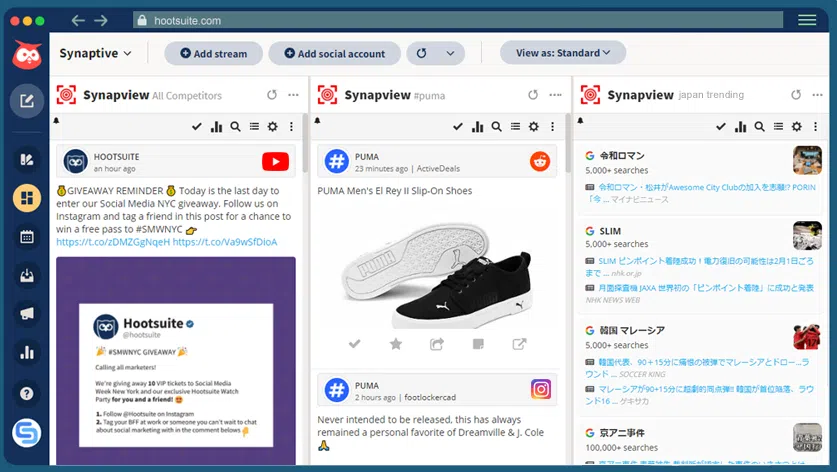 Synap View là một ứng dụng tích hợp với Hootsuite, cho phép theo dõi đối thủ cạnh tranh và hashtag trên các nền tảng như Instagram, YouTube, Reddit và các blog. Công cụ này cung cấp cái nhìn sâu sắc về xu hướng và hoạt động của đối thủ.