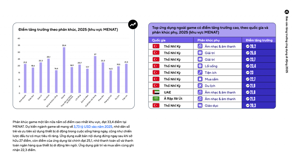 Khu vực MENAT ghi nhận Growth Score 33,3, phản ánh tốc độ chuyển dịch mạnh mẽ của người dùng sang mobile app. Các quốc gia như Thổ Nhĩ Kỳ, Ả Rập Xê Út và UAE đang chứng kiến sự tăng trưởng đồng đều trên nhiều phân khúc.