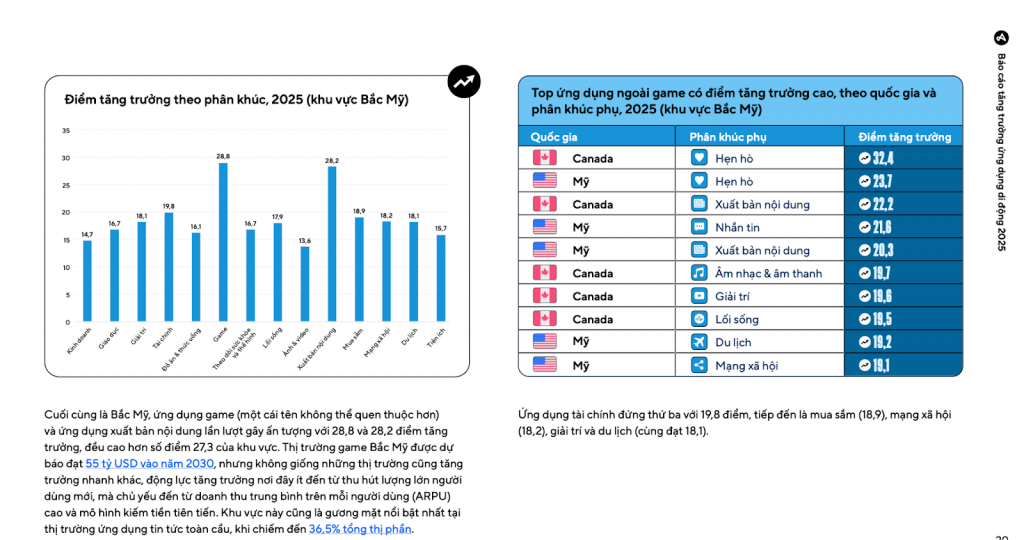 Tác động từ dữ liệu cho thấy Bắc Mỹ không còn là nơi để chạy đua số lượng, nhưng lại là thị trường tối ưu hóa doanh thu. Các phân khúc như game, tài chính cá nhân và hẹn hò tiếp tục tăng trưởng nhờ mức chi tiêu cao và khả năng duy trì tốt.